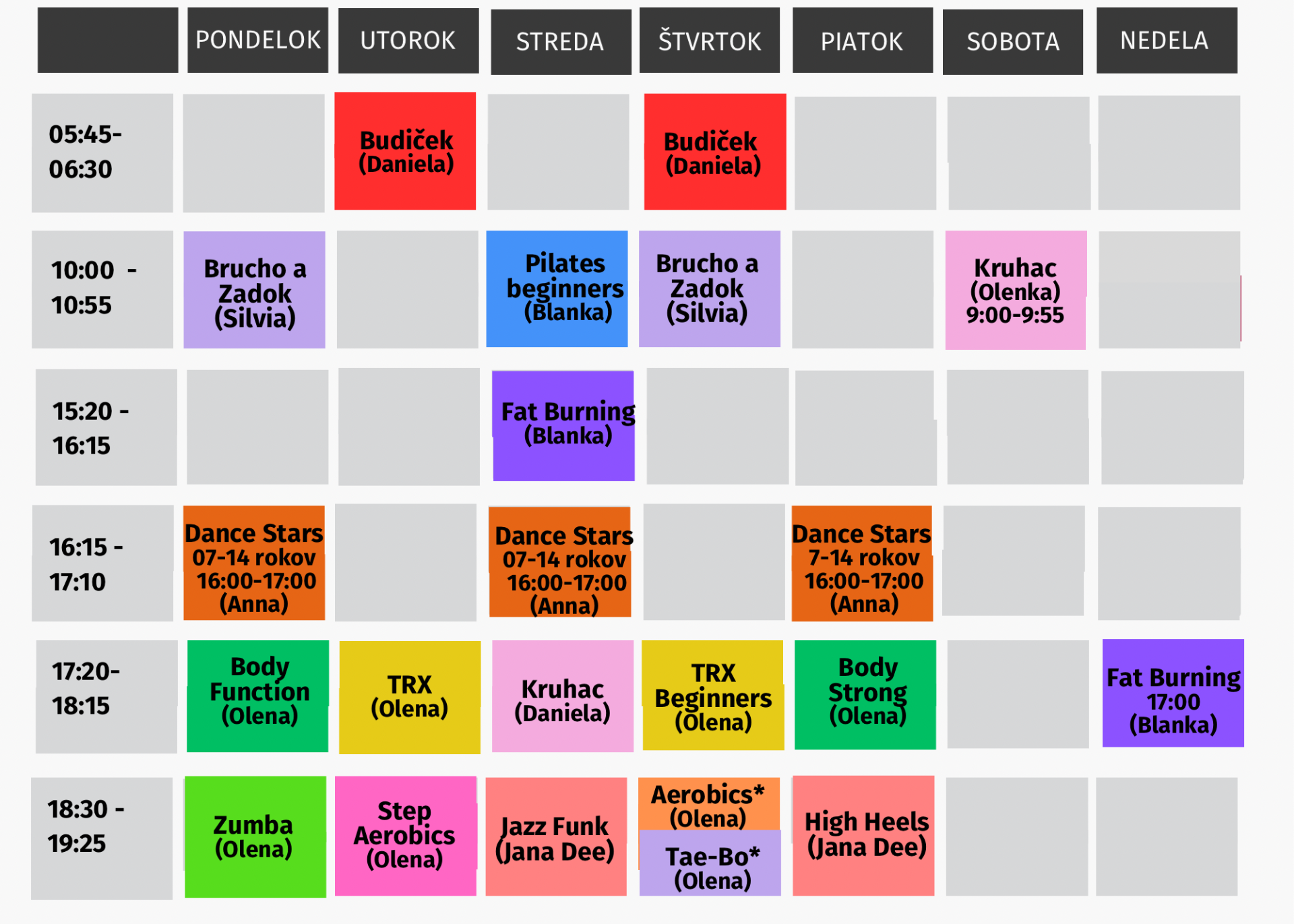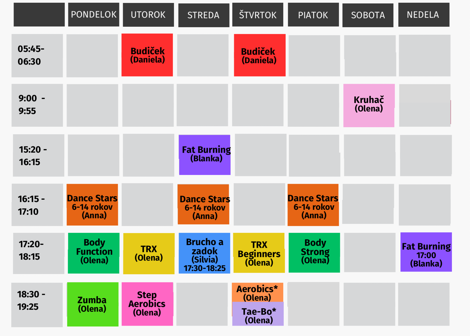 * Tréning Aerobics a Tae-Bo sa striedajú vo štvrtky – prvý a druhý týždeň v mesiaci prebiehajú na striedačku. Preto si vždy skontrolujte aktuálny rozvrh v prihlasovacom systéme, aby vám nič neušlo!